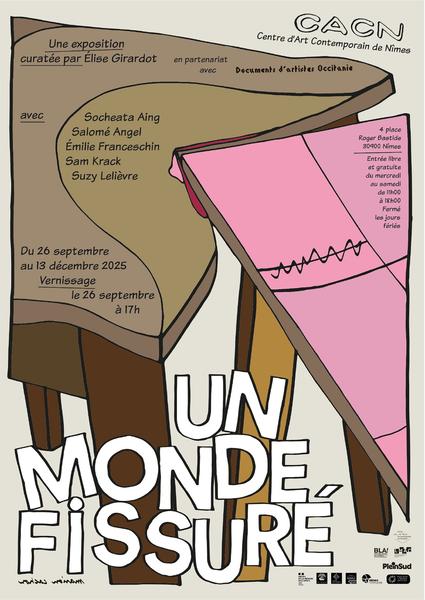 L’exposition réunit cinq artistes issus de la Région Occitanie, une terre aride sujette au réchauffement climatique. À travers leurs œuvres, chacun.e, nous signale de petits échecs, des erreurs ou des incompréhensions qui pourraient sembler anodines. Par l’usage des formes de la peinture, de la sculpture, de la vidéo ou de l’installation, ils nous font voir des brisures, des objets fragmentés, retouchés, voire recousus. Face aux récits inachevés, aux histoires qui s’étiolent, nous devenons spectateurs des fissures. Il y a là des énigmes à démêler, tantôt formelles ou narratives. Les récits de Socheata Aing, Salomé Angel, Émilie Franceschin, Sam Krack et Suzy Lelièvre se répondent, peu à peu, au fil du dédale des salles du CACN.